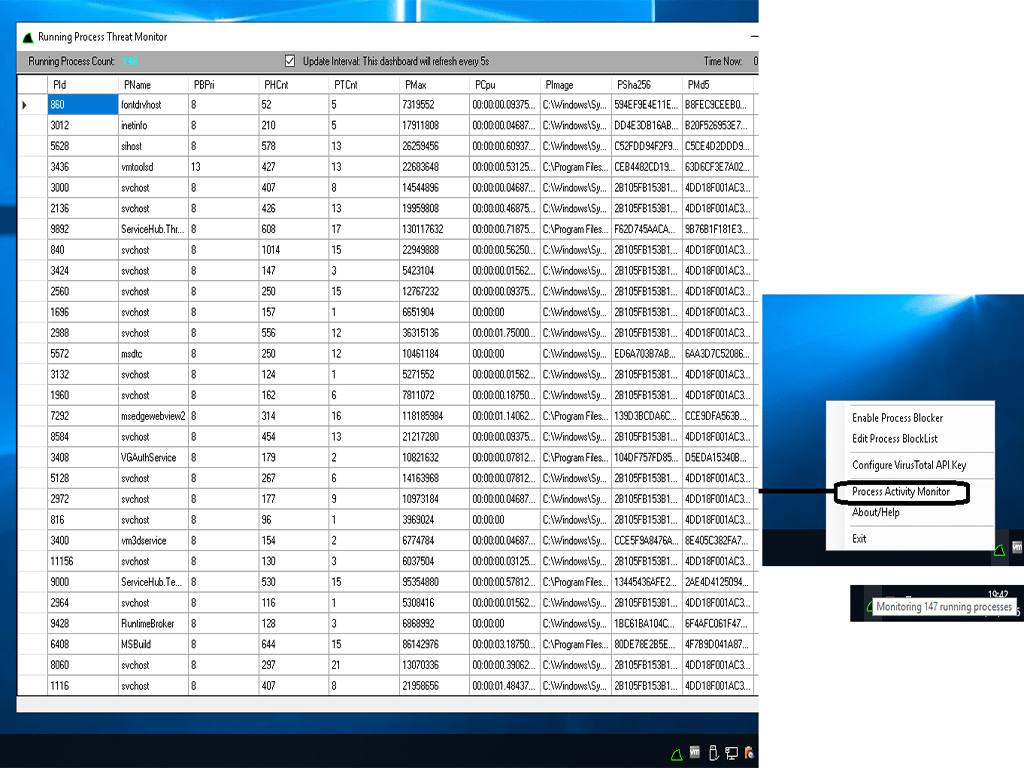 Combining System Tray and a UI – this tool captures all the running processes on your Windows Workstation and submits their calculated hashes in real-time to an online malicious hash blacklist site – flagging anything running on your machine that gets matched.